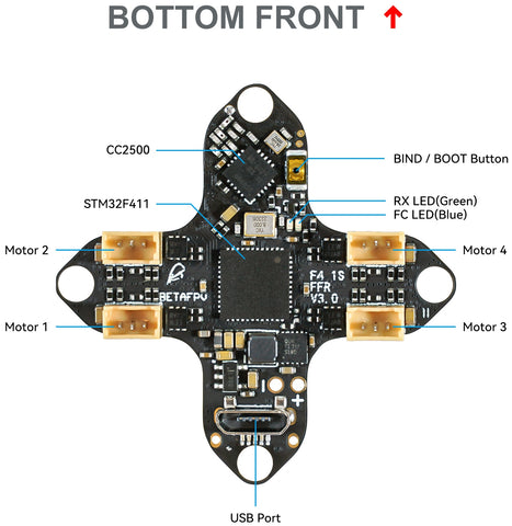 Bezszczotkowy kontroler lotu F4 1S 5A AIO jest dostarczany z domyślnym oprogramowaniem układowym betaflight_4.3.0_BETAFPVF411 (ELRS) lub betaflight_4.2.11_BETAFPVF411RX (Frsky). Domyślne oprogramowanie układowe dla wersji Serial ExpressLRS 2.4G RX obsługuje ELRS V2.4 RX.